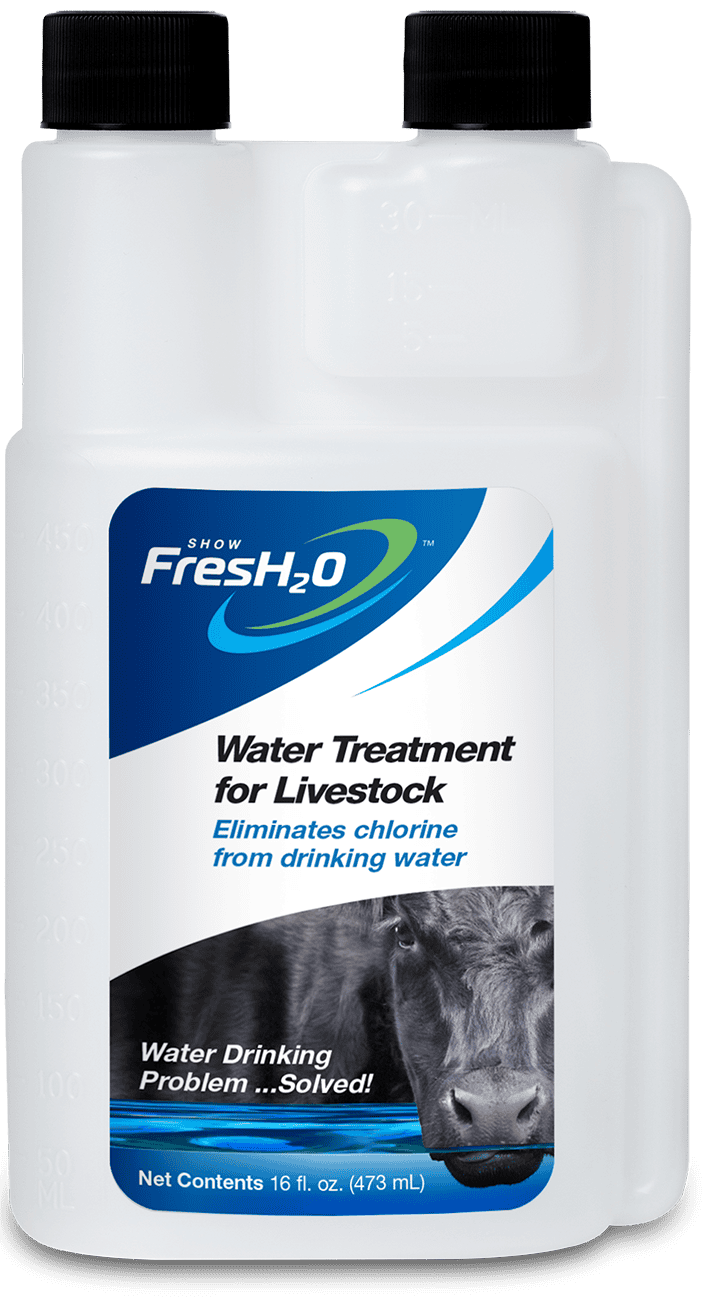 Show FresH2O is commonly used for show pigs, cattle, sheep, goats, and horses — any livestock or performance animal that may be sensitive to chlorine-treated water.